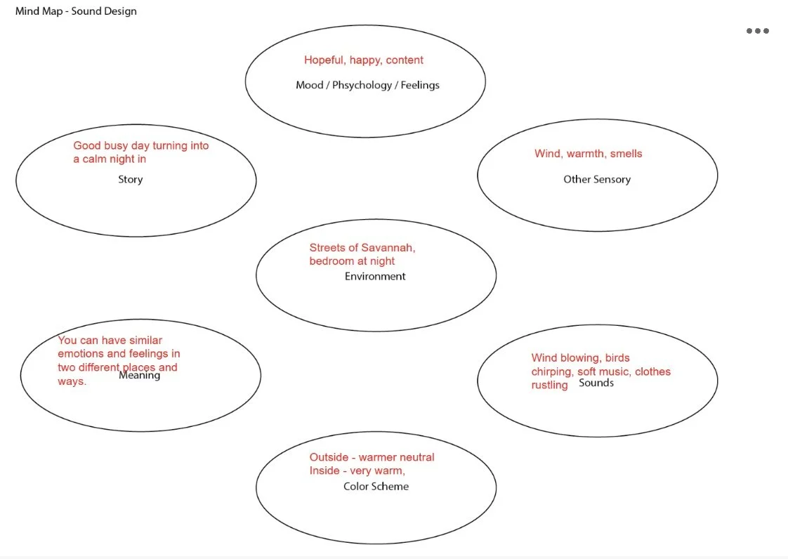 I planned to show 2 distinct locations, but have similar vibes between them. We start on a savannah street, birds chirping, wind blowing. The person is walking, maybe sitting reading. We are outside, but it feels warm and hopeful. Later we move inside to wind down for the night. The room is warm, and soft music is playing. We hear the gentle turn of a page as the person reads their book.